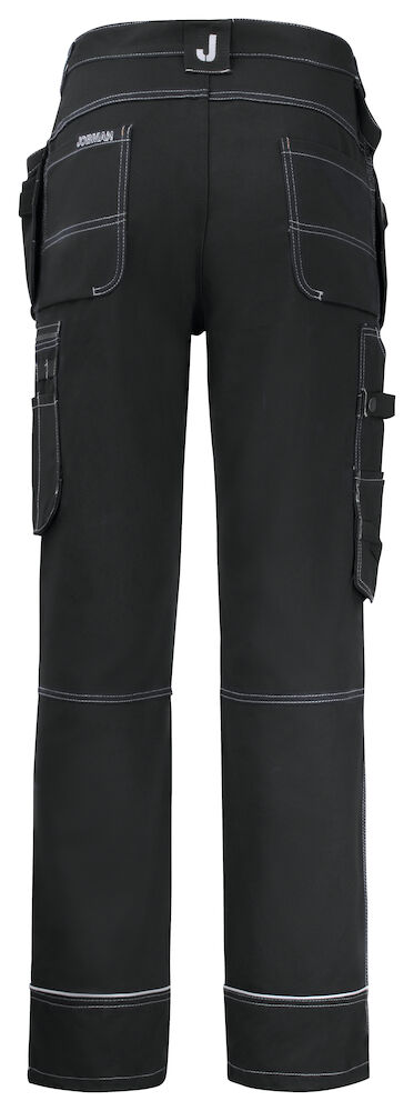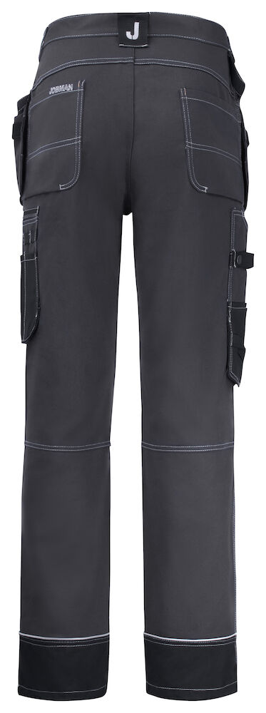 Cordura®-verstevigingen en niet-absorberend polyamide aan de onderzijde van de broekspijpen verhogen de levensduur. Extra details zoals een hamerlus, reflecterende bies en extra riemlussen bij grotere maten maken deze broek compleet. De kniestukzakken zijn op twee hoogtes te gebruiken in combinatie met Jobman kniestukken.
